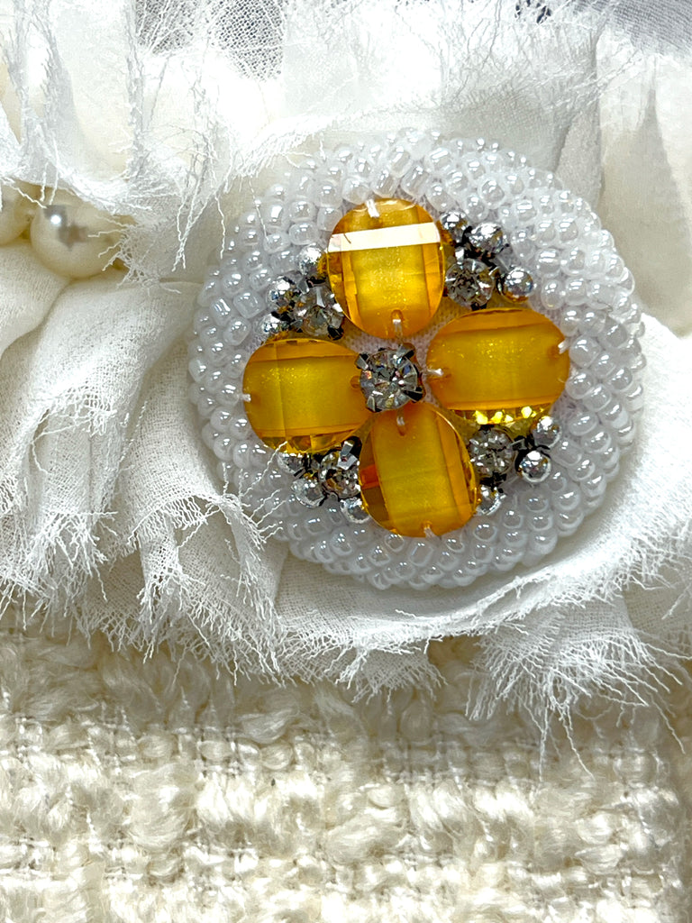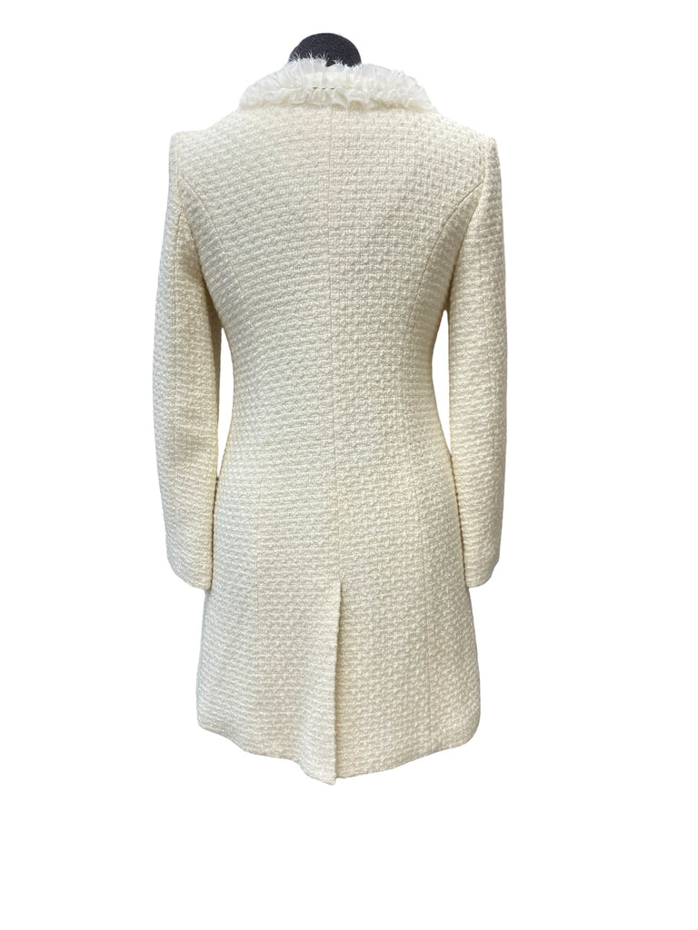 This Chanel replica coat captures unmistakable codes of elegance. Crafted in cream bouclé, the tailored silhouette is elevated by ornate jeweled buttons — each encircled with pearls, crystals, and golden amber accents. Delicate frayed trim softens the structured design, while four front pockets add both symmetry and function. A statement piece that channels Parisian couture, this coat is designed for the collector who values luxury’s timeless allure.