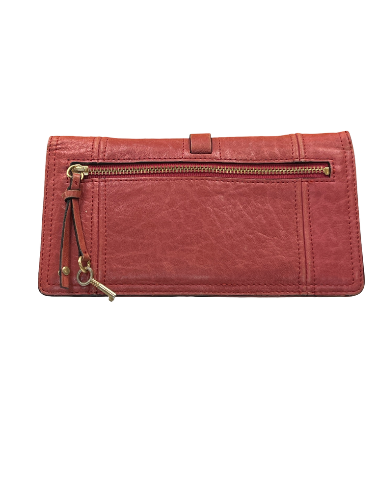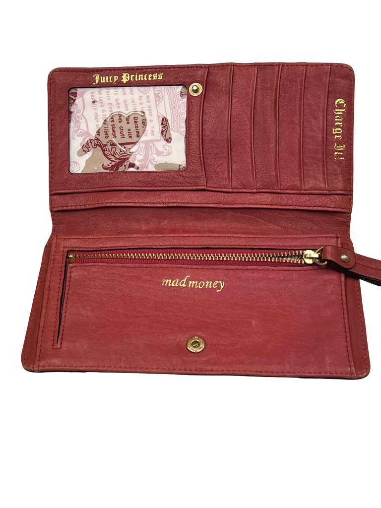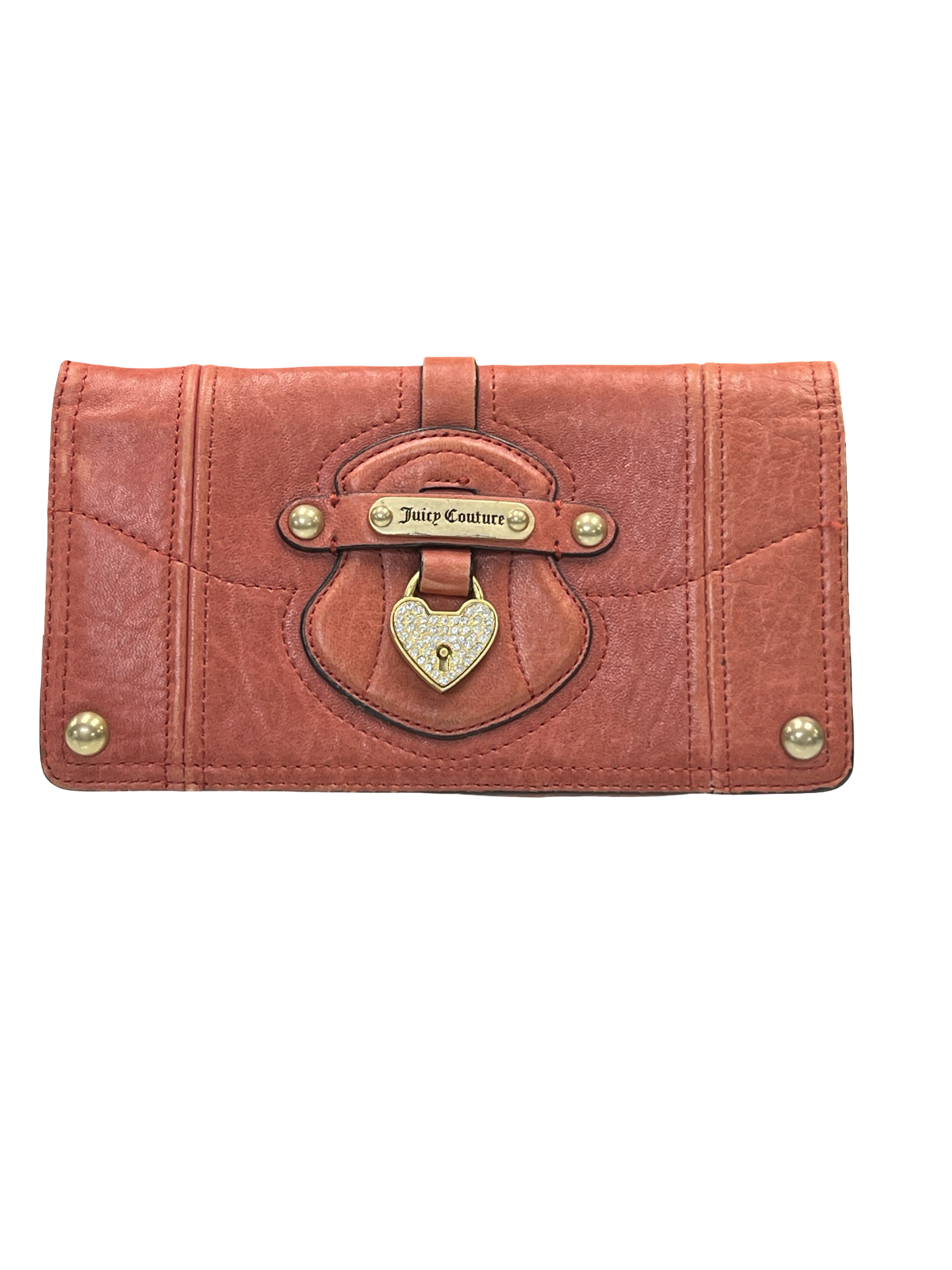 Add a playful touch of nostalgia with this Juicy Couture clutch wallet. Crafted in a warm terracotta leather, it features the brand’s signature heart-shaped lock charm and gold-tone hardware for a dose of Y2K glamour. Inside, embossed details like “Juicy Princess” and “Mad Money” capture the label’s iconic early-2000s personality.