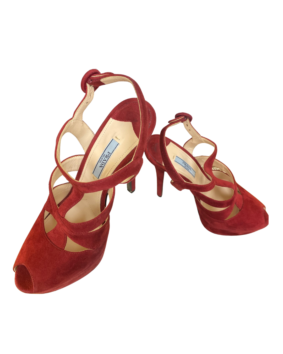 Step into pure sophistication with these striking Prada red suede platform heels. Crafted in Italy, they feature sculpted crossover straps, a sky-high stiletto heel, and a bold peep-toe silhouette that radiates confidence. The plush suede adds a rich, tactile depth to this statement shoe.