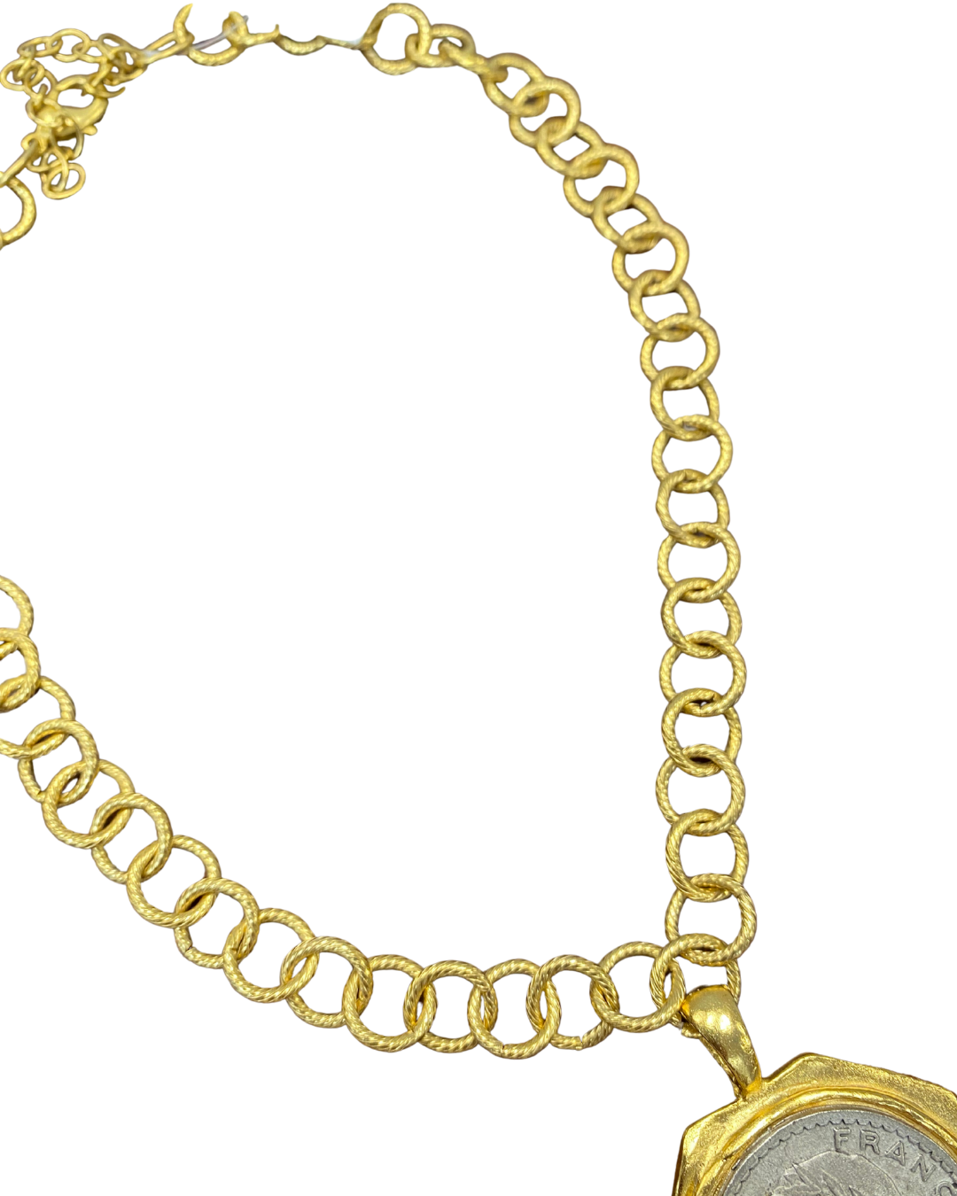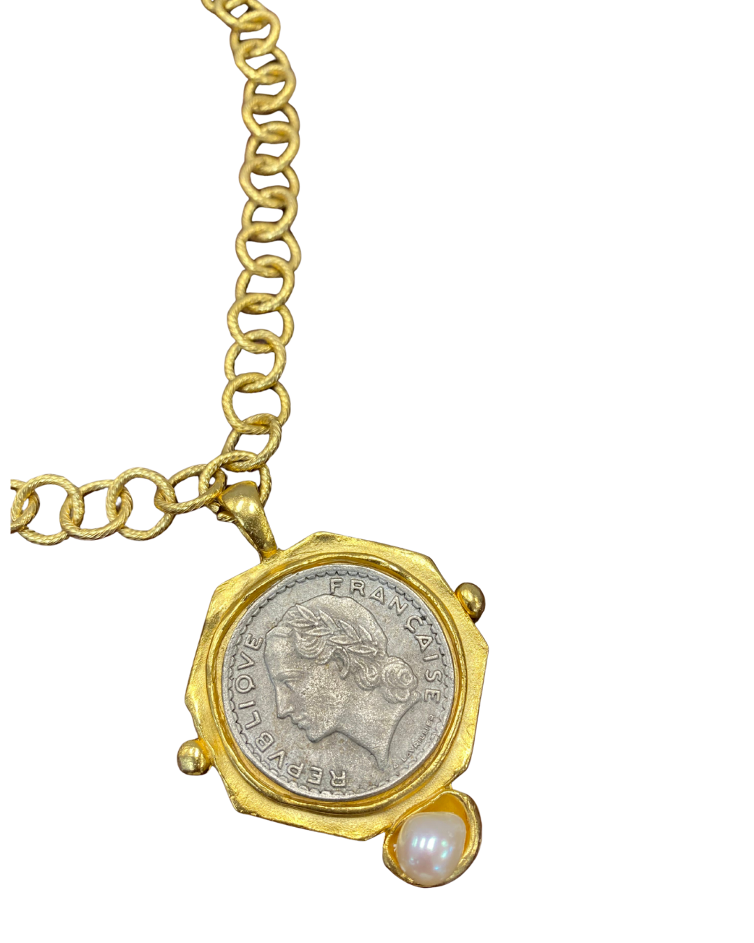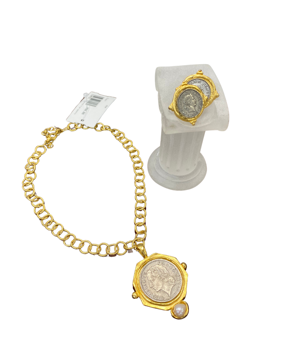 Vintage character meets modern styling in this French coin jewelry duo. Featuring a statement coin pendant necklace paired with matching coin stud earrings, this set blends historical charm with bold, wearable design.